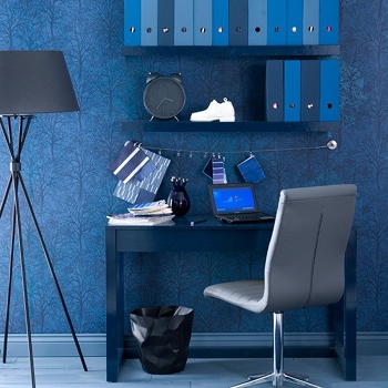 Plava boja je idealna za kućnu kancelariju. Efekat plave nijanse deluje opuštajuće. Postoji nešto ohrabrujuće u plavoj boji, što podstiče na razmišljanja. Ona deluje intelektualno i u njoj nema previše emotivnosti, a ni agresivnosti.