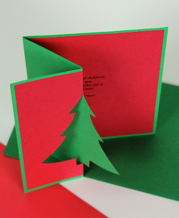 Ovu čestiku je jako jednostavno napraviti, potreban vam je karton u crvenoj i zelenoj boji, makaze, olovka, skalpel i lepak. Postavite prvo zeleni karton pa na njega nalepite crveni koji će se naći sa unutrašnje strane čestitke. Na prednjoj strani, u desnom uglu čestitke nacrtajte polovinu jelke. Skalpelom izrežite konturu koja predstavlja polovinu jelke, potom presavijte prednju stranu čestitke u levo, tako da vam ta izrezana polovina konture jelke ostane nesavijena. Sada ste dobili naslovnu stranu čestitke koja se sastoji od jedne polovine u crvenoj boji i druge polovine u zelenoj boji. Ostalo je još samo da napišete svoje iskene novogodišnje želje i pošaljete dragoj osobi.
