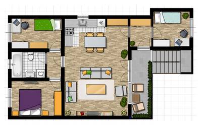 U dnevnoj sobi se predviđa torosed, dvosed i fotelja sa većim set stolom. Trosedom se odeljuje prostorija na: deo za sednje i kuhinjsko/trpezarijski deo.