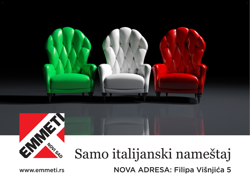 17.10.2014 U Novom Sadu na novoj lokaciji u ulici Filipa Višnjića 5, otvoren je ekskluzivan salon Italijanskog nameštaja Emmeti koji svojim širokim asortimanom može uspešno odgovariti na sve zahteve klijenata.
